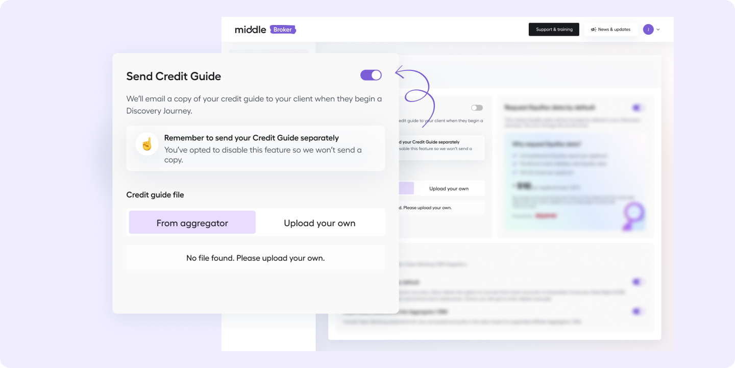 Default settings: By default this setting will be toggled 'On' allowing us to send this in a separate email to your client upon starting a Discovery Journey. You would have provided us with your Credit Guide upon signing up.