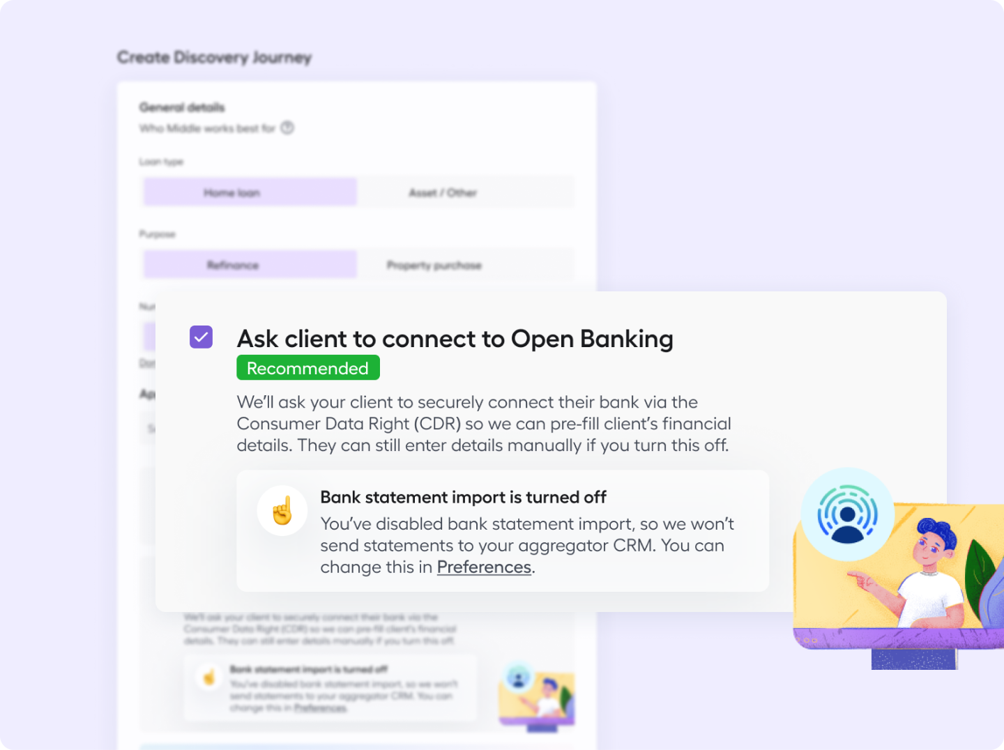 Middle includes the ability for your client to connect to directly to their financial institutions via Open Banking. This allows us to pre-fill their financials in conjunction with Equifax. For every account connected, we'll also retrieve 3 and 6 month bank statements, meaning your client won't need to manually provide these later.